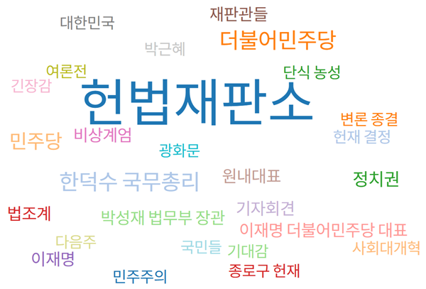 ‘윤 대통령 탄핵심판 선고’ 관련 기사에 가장 자주 등장한 연관키워드는 탄핵심판을 맡은 ‘헌법재판소’였으며, 그 뒤는 ‘한덕수 국무총리’, ‘더불어민주당’, ‘박성재 법무부 장관’, ‘이재명 민주당 대표’ 등의 순이었다.