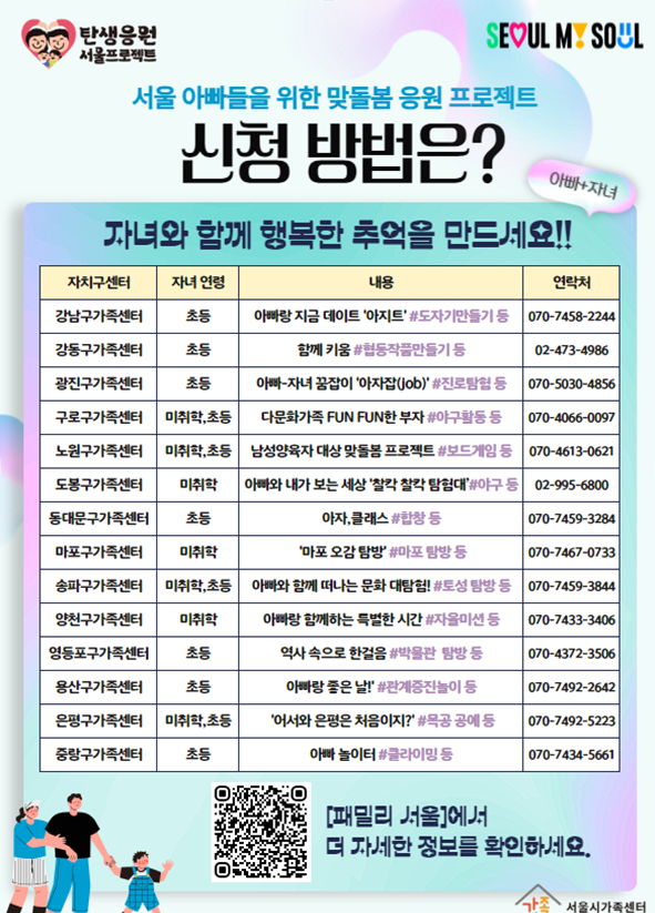 맞돌봄 프로젝트에 대한 자세한 운영일정 및 프로그램 내용은 서울가족포털 ‘패밀리서울’을 통해 확인할 수 있다. 이외에도 가족센터에서 제공하는 다양한 가족서비스 정보(가족교육, 상담, 문화, 돌봄, 다문화가족서비스 등)는 패밀리서울에서 확인할 수 있다.