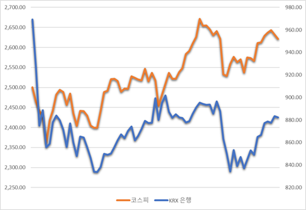 25일 한국거래소에 따르면, KRX 은행 지수는 지난 24일 기준 883.37로 연초(833.88) 대비 5.93% 상승했다. 지난해 말 비상계엄 사태의 여파에서 회복하는 모양새지만, 국내 증시의 전반적 회복세에 비하면 반등 속도가 더딘 편이다. 실제 같은 기간 코스피는 2398.94에서 2632.07로 9.72% 상승했다. 올해 은행주 수익률이 코스피를 4%포인트 가량 하회한 셈이다.