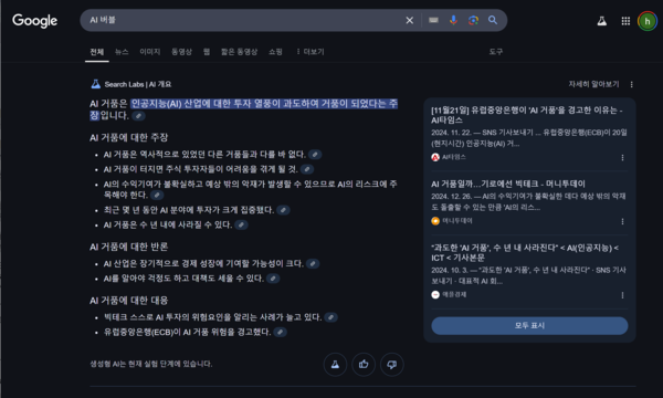 AI 검색의 부상에 위협을 느낀 구글은 ‘AI 개요(AI Overview)’와 같은 기능을 추가하며 대응에 나서고 있다. 사용자가 검색어를 입력하면 기존의 링크가 나열된 화면 대신, 질문의 의도를 반영한 요약 정보가 페이지 상단에 제공된다.