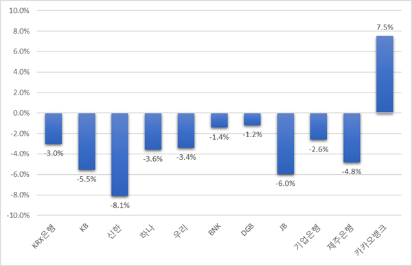 주요 은행지주사들도 대부분 주가 하락세를 피하지 못하고 있다. 실제 신한지주 주가는 지난해 말 대비 8.1% 하락했으며, KB(△5.5%), 하나(△3.6%), 우리(△3.4%) 등 다른 4대 은행지주사 주가도 새해 들어 좀처럼 반등하지 못하고 있다. BNK(△1.4%), DGB(△1.2%), JB(△6.0%) 지방 은행지주사 주가 또한 마찬가지다.