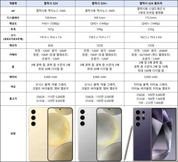 갤럭시 S24 시리즈는 오는 31일에 국내에 공식 출시된다. 삼성전자는 19일부터 25일까지 S24 시리즈의 한정 판매를 진행한다. 갤럭시 S24 시리즈는 '갤럭시 S24 울트라', '갤럭시 S24+', '갤럭시 S24' 총 3개 모델로 이루어져 있으며, '삼성닷컴'과 '삼성 강남'에서만 만날 수 있는 차별화된 색상의 자급제 모델도 출시된다.