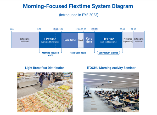 또한 코로나19 팬데믹 이후 이토추 상사는 직원들이 일주일에 이틀 동안 집에서 일할 수 있도록 허용했다. 2022년 이토추는 한 단계 더 나아가 근무 시간을 8시에서 6시로 단축해 이르면 오후 3시에 퇴근할 수 있게 됐다.