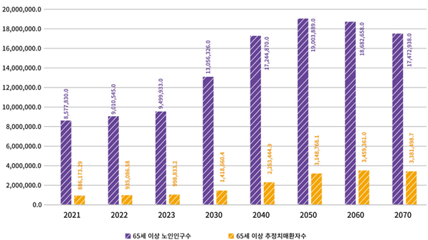 문제는 고령화 속도가 빨라지면서 치매 환자도 급속도로 늘어날 것이 확실시된다는 점이다. 중앙치매센터에 따르면, 65세 이상 치매 환자 수는 지난 2021년 기준 89만2002명으로 전체 노인인구(857만7830명)의 10.4%를 차지했다. 중앙치매센터는 치매 환자 수가 지난해 100만명을 돌파해 오는 2030년 142만명, 2040년 226만명, 2050년 315만명, 2060년 346만명까지 늘어날 것으로 추정하고 있다.