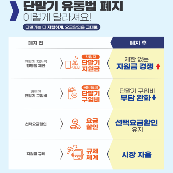정부는 단말기유통법의 경우 미국·영국·프랑스 등 시장경제를 표방하는 대부분의 선진국에는 없는 규제법으로 글로벌 규제 스탠다드에 부응하지 못하는 측면이 있으며, 시장경쟁 강화를 통한 소비자 후생 증진이 필요한 상황이므로 단말기유통법 관련 규제정비를 추진하기로 했다고 밝혔다. 이를 통해 통신사와 유통점 간 자유로운 지원금 경쟁을 촉진하고, 국민들이 저렴하게 휴대전화 단말을 구입할 수 있는 기회를 제공하게 될 것으로 기대했다.