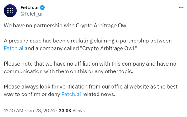 앞서 CAO는 지난 21일 보도자료를 통해 인공지능 블록체인 플랫폼 페치에이아이(Fetch.ai)와 1000만 달러의 투자계약을 체결하며 전략적 파트너십을 구축했다고 국내외 언론에 알린 바 있다. 하지만 페치에이아이는 23일 공식 소셜미디어 계정을 통해 해당 보도자료는 사실이 아니라며 CAO와 아무 관련이 없다고 반박했다.