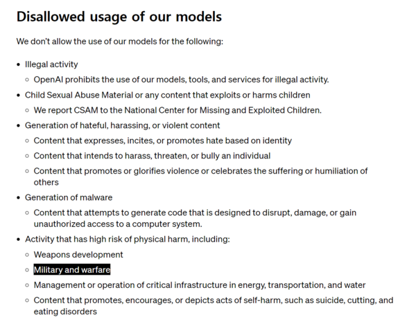 오픈 AI는 이에 대해 "우리의 정책은 우리의 도구가 사람을 해치거나, 무기를 개발하거나, 통신을 감시하거나, 다른 사람을 다치게 하거나, 재산을 파괴하는 데 사용되는 것을 허용하지 않고 있다."라며 "그러나 오픈 AI가 새로운 사이버 보안도구를 개발하기 위해 국방부 산하의 고등연구계획국가 협력하는 등 우리의 사명에 부합하는 국가 안보 사용 사례가 있다."라고 밝혔다. 국방기관과의 원활한 협력을 위해 조항을 수정했다는 관측이다.