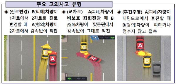 금감원에 따르면, 주요 사고 유형은 ▲ 진로변경하는 상대 차량에게 감속하지 않거나 가속해 고의추돌한 경우(62.5%) ▲교차로에 진입하거나 좌(우)회전하는 상대 차량이 확인돼도 감속하지 않고 그대로 진행하여 접촉한 경우(11.7%) ▲일반도로에서 후진중인 상대 차량을 대상으로 피하거나 멈추지 않는 경우(7.0%) 등이었다.