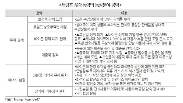 미국우선주의를 모토로 하는 트럼프 전 대통령이 당선될 경우 IRA과 탄소중립 등 조 바이든 행정부의 주요 정책이 뒤집힐 가능성이 있기 때문이다. 특히 IRA정책과 관련 바이든 정부를 믿고 미국에 투자한 현대차 등 국내 기업들의 손실이 우려되는 상황이다.