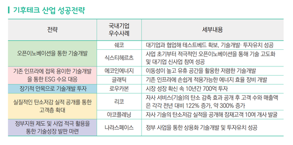 그러면서 "기후테크는 기술 실증 기회가 적고 수익을 단기간에 낼 수 없어 투자 불확실성이 높기에 민간에서 주도하기에는 한계가 따른다"면서 "정부는 선진 국가와의 격차를 좁히기 위해 기후테크 산업이 필요로 하는 지원 사항을 제도화하고, 경제성에 밀려 개발되지 못한 기술에 대한 투자에 매진해야 한다"고 강조했다.