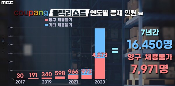 13일 MBC는 쿠팡 블랙리스트로 추정되는 내부파일을 입수했다고 보도했다. 쿠팡의 블랙리스트로 추정되는 PNG문건에 오른 사람은 16,450명이다. 등록일자와 근무지, 요청자와 작성자에 이어, 이름과 생년월일, ‘원바코드’로 불리는 로그인 아이디, 연락처 순으로 정리되어 있는 이 파일은 ‘폭언, 욕설 및 모욕’, ‘도난사건’, ‘허위사실 유포’, ‘고의적 업무방해’ 등 총 48종류로 분류되어 있다.
