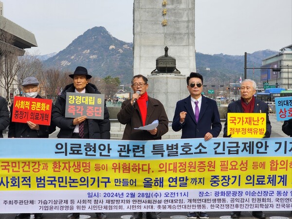 송운학 공익감시 민권회의 의장은 기자회견에서 “국민의 건강과 생명을 볼모로 의료계와 정부가 극단적인 강경대립을 계속한다면, 이는 그 어떤 명분으로도 합리화하거나 정당화될 수 없다”면서 “이제 국회를 주도하는 양당이 중재에 나설 때다.”라고 설명했다.
