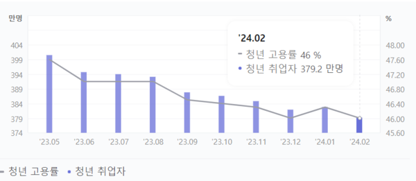 청년층이 고용률은 오르고 있지만, 질 좋은 일자리를 구하지는 못하는 것으로 나타났다. 통계청이 지난 13일 발표한 ‘2024년 2월 고용동향’에 따르면 청년층(15∼29세) 취업자는 청년 인구 감소 여파 등으로 전년보다 6만1000명 줄어 16개월째 감소세를 지속했다. 다만 청년 고용률은 전년보다 0.5%포인트(p) 오른 46.0%를 기록했다. 관련 통계 작성 이래 2월 기준 역대 최고다.