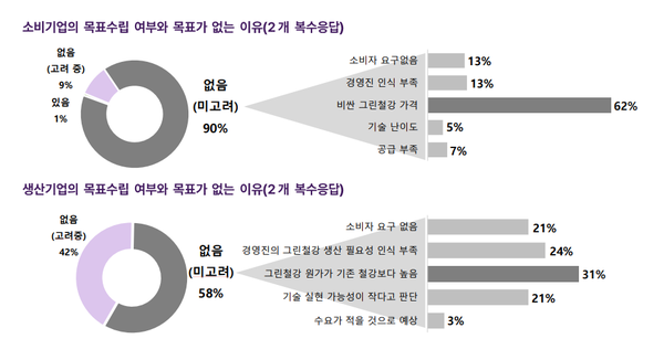 조사 결과, 그린철강 준비는 소비 기업이 생산 기업보다 크게 뒤처져 있었다. ‘그린철강에 대한 목표도 없고 향후 목표에 대한 계획도 없다’고 답한 비율이 소비 기업과 생산 기업에서 각각 90%와 58%로 집계된 것. ‘목표를 세우지 않았지만, 향후 목표 수립을 고려하고 있다’는 응답 비율은 생산 기업에선 42%, 소비 기업에선 9%에 불과했다.