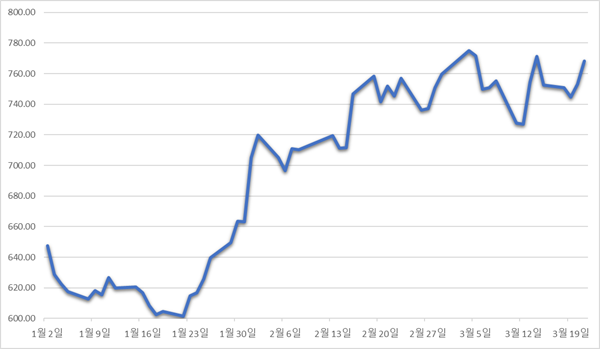 21일 한국거래소에 따르면, KRX 증권지수는 이날 전일 대비 14.96포인트(1.99%) 오른 768.28로 장을 마감했다. 이는 연초(647.51) 대비 120.77포인트(18.7%) 오른 것으로, 같은 기간 코스피 상승률(3.2%)의 6배에 달하는 수준이다.