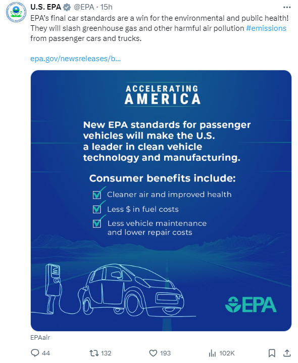 미 환경보호청은 이 규정이 전기차 의무사항이라기보다는 배출가스 문제를 해결하고 공중보건을 보호하기 위한 공해 규정임을 강조해왔다. 이번 차량 배출가스 규제 도입으로 2055년까지 이산화탄소 배출량이 70억 톤(t)가량 줄어들 것으로 추산했다.