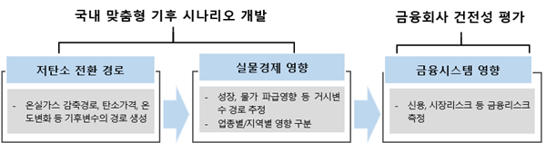 기후 스트레스 테스트는 저탄소 전환 및 자연재해 등으로 인한 기후변화 대응 비용이 발생해 거시경제 여건 및 기업 수익성이 악화하면서 결국 금융회사의 여신·투자 손실로 이어지는 과정을 계량화한 기후리스크 측정 수단이다.