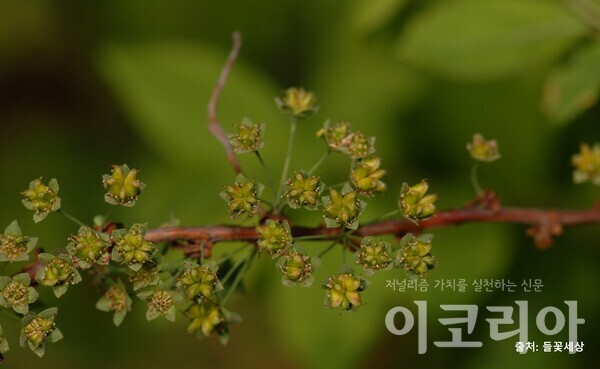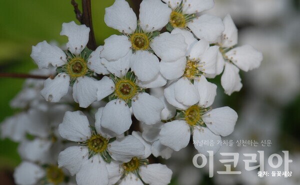 ‘공조팝나무’는 조팝나무와 꽃모양이 비슷하지만, 솜사탕을 붙여놓은 듯 줄기를 따라 꽃뭉치가 달려 있는 모양이 특징이다. 공조팝나무의 이름은 꽃차례가 공처럼 둥근 조팝나무라는 뜻에서 유래되었다고 한다. 공조팝나무는 조팝나무보다 우리 주변의 길가나 관상수로 쉽게 만날 수 있다.