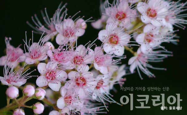 ‘꼬리조팝나무’는 흰색 꽃이 피는 조팝나무, 공조팝나무와 달리, 짙은 분홍색 꽃이 핀다. 꼬리조팝나무의 이름은 꽃차례가 꼬리처럼 긴 종류의 조팝나무라는 뜻에서 유래되었다고 한다. 꼬리조팝나무 꽃은 봄이 지나고 여름이 다가오는 시기에 피는데, 가지 끝에 분홍색 아이스크림처럼 긴 꽃차례가 매력적이다. 또한 앞선 조팝나무, 공조팝나무는 수술이 꽃잎보다 짧지만, 꼬리조팝나무는 수술이 꽃잎보다 2배 정도 길어 독특한 모양을 띠고 있다.