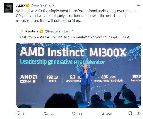 또 2027년까지 AI 칩 시장이 4000억 달러(526조6800억 원) 수준으로 4년 만에 약 9배 성장할 것으로 전망했다. 이어 내년 AMD의 AI 칩 매출은 20억 달러(2조6334억 원)에 이를 것이라고 내다봤다.