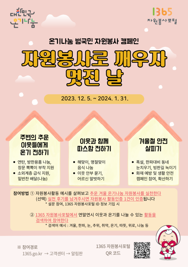 정부는 지난 5일부터 내년 1월 말까지 온기나눔 범국민 자원봉사 캠페인 ‘자원봉사로 깨우자 멋진 날’을 진행하고 있다. 방한용품 나눔이나 밑반찬 배달 봉사부터 이웃 안부 묻기, 동네 눈치우기 등 다양한 활동 등을 자원봉사로 인정했다. 1354 자원봉사포털에 실천후기를 남기면 자원봉사 활동인증 1건으로 인증된다.