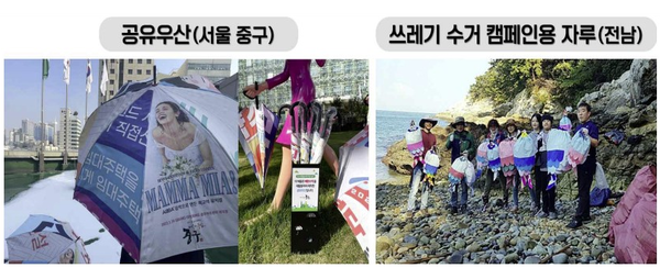 폐현수막 재활용 지원사업을 통해 서울 중구는 수거한 폐현수막 1,720장을 재활용하여 공유우산 430개를 제작한 후, 관내 주민센터・복지관 등 15개 공공기관에 비치하여, 시민들이 자유롭게 사용할 수 있도록 하였다. 전라남도는 주민・시민단체 등이 직접 폐현수막을 재활용해 만든 해양 쓰레기 수거용 자루로 환경정비 운동을 펼쳤다.