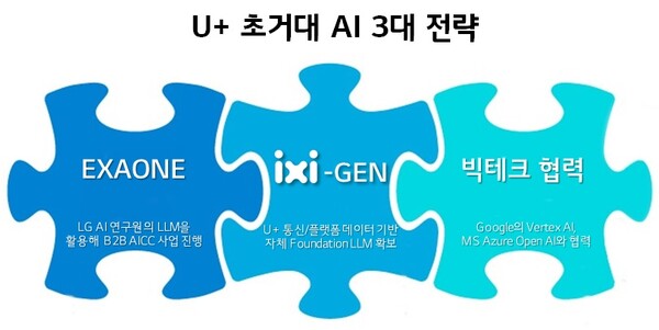 LG 유플러스는 지난 10월 자체 개발한 통신 맞춤형 AI ‘익시젠’의 개발을 발표했다. 자사 고객을 위한 통신·플랫폼 서비스에는 새로 개발되는 익시젠을, 전문가 전용 초거대 AI서비스에는 LG AI 연구원과 협력한 초거대 AI ‘엑사원(EXAONE)’을 각각 활용하는데 더해 구글과 MS 등 해외 빅테크와의 협력까지 합쳐 초거대 AI 3대 전략을 통해 경쟁력을 강화하겠다는 계획이다.