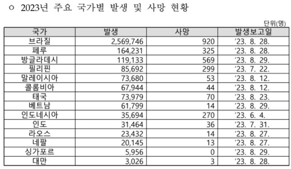 우리나라도 코로나 종식 이후 해외여행 활성화로 뎅기열 환자 유입이 증가 추세다. 질병관리청 자료에 따르면 2022년부터 뎅기열 환자 유입이 늘어나기 시작해 2023년에는 총 206명이 확인되었다. 이는 전년(103명)대비 2배 증가한 수치다.