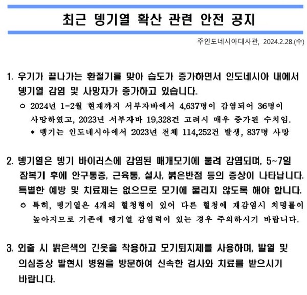 주인도네시아 대사관에는 지난 2월 뎅기열 확산에 대한 안전공지까지 올라왔다. 각종 여행 관련 커뮤니티엔 뎅기열 발병으로 인해 현지에서 치료하고 와야할지 한국으로 와야할 지 곤란해하는 글들이 많이 올라온다.