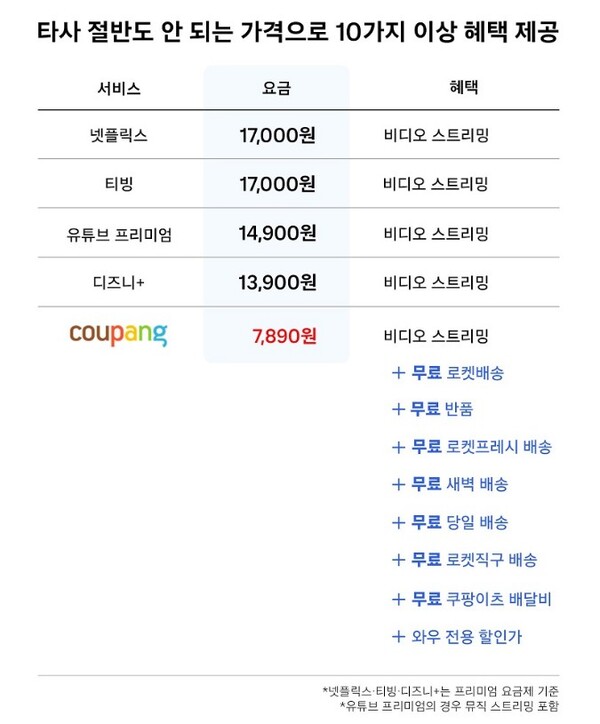 쿠팡의 와우 멤버십 혜택은 무료 배송·배달·직구, 무료 반품과 무료 OTT 등이다. 지난달엔 와우 혜택에 쿠팡이츠의 무료배달 서비스를 추가해, 배답앱들이 덩달아 배달비 무료서비스를 제공하고 있다. 쿠팡은 와우 멤버십 구독을 통해 한 달에 3번만 로켓배송을 주문(3000원X3회=9000원)해도 월 요금 이상의 이득을 본다고 설명한다.