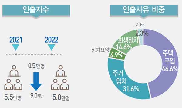 퇴직연금 중도인출 사례는 지난 2019년(7만3천명, 2.8조원) 이후 3년간 감소 추세를 보이고 있지만, 아직 그 규모가 작지 않다. 특히 최근 들어 주거 비용 문제로 퇴직연금을 빼 쓰는 비중이 점차 늘어나고 있다. 통계청에 따르면, 2022년 퇴직연금 중도인출 사유 중 비중이 가장 높았던 것은 주택 구입으로 인원 기준 46.6%(금액 기준 55.6%)를 차지했다. 그 다음은 주거 임차로 인원 기준 31.6%(금액 기준 29.2%)를 차지했다.