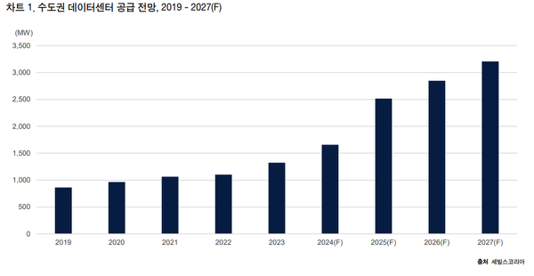 19일 관련업계에 따르면 한국 데이터센터 시장은 IT 산업의 발전에 힘입어 빠른 속도로 성장해 2027년까지 수도권 내 데이터센터 공급 2023년 대비 약 2.4배 증가할 예정이다.