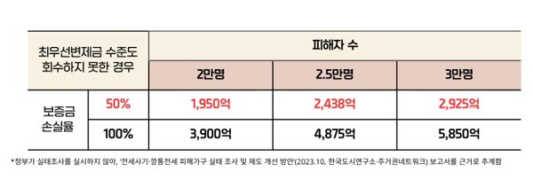 전세사기·깡통전세 피해자 전국대책위원회와 전세사기·깡통전세 문제 해결을 위한 시민사회 대책위원회는 지난해 8∼9월 실시한 자체 실태조사를 바탕으로 피해자 수를 2만5천 명, 그중 보증금 일부조차 회수할 수 없는 후순위 임차인이면서 최우선 변제 대상이 아닌 이들을 50%로 가정하면 최대 4천875억 원이 소요된다고 주장했다. 피해자 수를 3만 명으로 늘려도 최대 5천850억 원이라는 것이 단체의 계산이다.