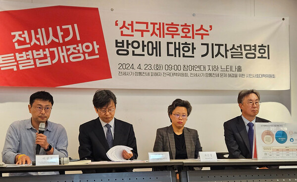 대책위는 23일 기자회견을 통해 “국토부가 피해 가구와 보증금 피해 규모, 최우선 변제금을 받지 못하는 가구 등 구체적 근거도 없이 (선구제 후회수 방안을) 왜곡·폄훼하고 있다”며 “피해 구제 대책에 토대가 될 실태조사를 실시해야 한다”고 촉구했다.