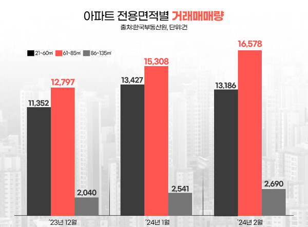 여기에 전용면적 61~85㎡이하 거래량은 지난해 12월 1만2,797건에서 올해 1월 1만5,308건, 올해 2월 1만6,578건을 기록해 거래량 상승세가 가장 높았다.