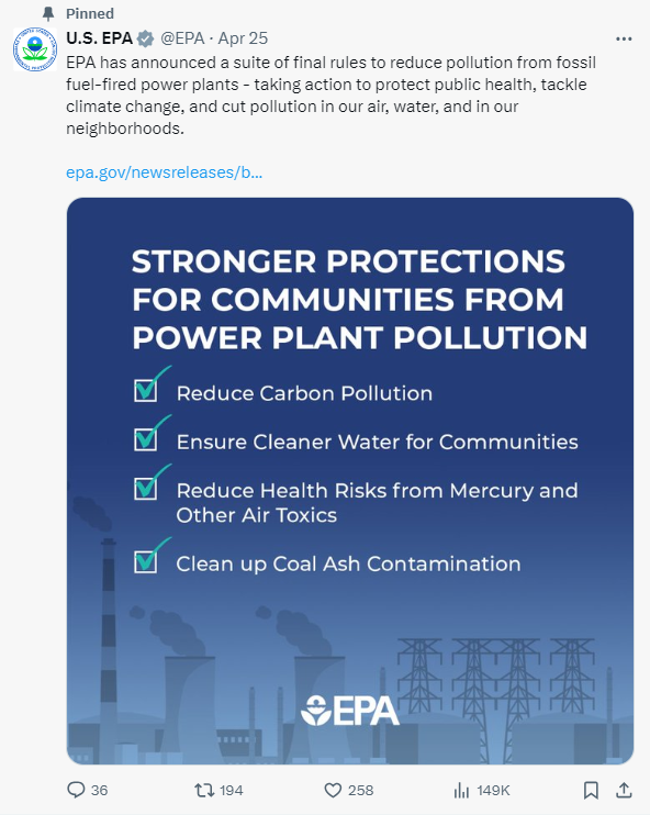 새 규제 중 핵심은 온실가스 배출에 대한 제한이다. 이 규정은 새로운 천연가스 화력발전소와 기존 석탄 화력발전소가 배출을 대폭 줄여야 한다는 것을 의무화한다. 석탄발전소는 2039년까지 문을 닫거나 탄소 배출의 90%를 포집해야 한다.