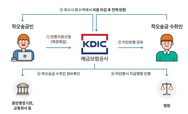지원대상에 해당될 경우 예보는 착오송금인으로부터 부당이득반환채권을 매입한다. 예보는 금융회사, 통신사, 행정안전부 등을 통해 착오송금 수취인의 연락처 및 주소를 확보하여 자진반환을 권유하여 회수하거나, 법원의 지급명령을 통해 회수를 진행한다.