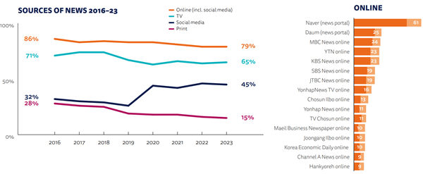 로이터저널리즘연구소가 지난해 발표한 ‘디지털 뉴스 리포트 2023’에 따르면, 한국의 뉴스 소비자들이 가장 많이 뉴스를 접하는 경로는 온라인(소셜미디어 포함 79%)이었다. 반면 ‘종이신문’이라고 답한 응답자는 2016년 28%에서 지난해 15%로 13%포인트나 감소했는데, 이는 뉴스 유통구조가 완전히 디지털 중심으로 재편됐다는 사실을 보여준다.