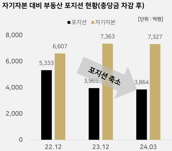부동산 금융과 관련해서도 보수적인 기준에서 대손충당금을 적립하는 등 리스크 관리에 힘쓰고 있다. 다올투자증권에 따르면, 자기자본 대비 부동산 포지션 비중(충당금 차감 후)은 2022년 말 80.7%에서 올해 1분기 52.7%로 크게 줄어들었다. 다올투자증권은 “보수적 기준에서 대손충당금을 충실히 적립하고 부실 사업장 관리를 강화해 PF발 위기를 극복하는 중”이라며 “1분기 브릿지론은 684억원으로 향후 추가 손실 가능성을 최소화했다”고 설명했다.