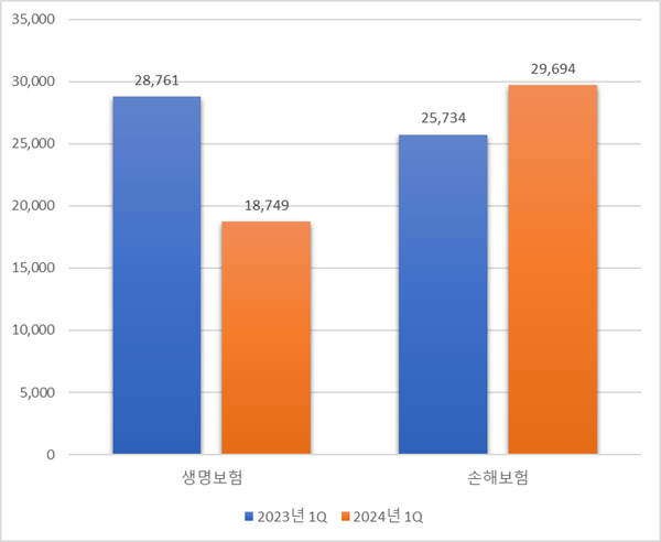 24일 금융감독원에 따르면, 생보사 22개, 손보사 31개 등 53개 보험사의 올해 1분기 당기순이익은 4조8443억원으로 전년 동기 대비 6052억원(△11.1%) 감소했다.