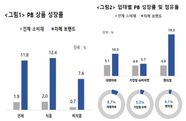 조사 결과 국내 PB 상품 시장 규모는 전년 대비 11.8% 성장했다. 같은 기간 1.9% 성장에 그친 전체 소비재 시장 성장률보다 약 6배 높은 수치다. 특히 부문별 PB 시장 성장률은 비식품 7.4%, 식품 12.4%로 식품 부문이 전체 성장을 이끌었다.