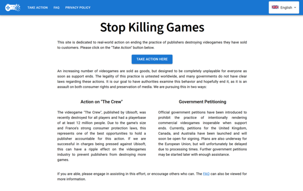 이에 해외의 게임 인플루언서 로스 스콧은 라이브 서비스 게임의 이용자들은 게임 구매와 플레이에 막대한 시간과 돈을 투자하고 있지만, 정작 게임의 소유권은 온전히 게임사가 가지고 있어 게임의 서비스가 종료되면 게임에 완전히 접근할 수 없게 된다는 점을 문제 삼았다. 또 고가에 구매한 라이브 서비스 게임이 개발사의 지원이 종료되면 플레이할 수 없게 되어버리는 상황은 소비자 권익에 대한 침해라고 주장하며 'Stop killing Games'(게임 죽이기를 멈춰라)라는 이름의 웹사이트를 만들어 지원이 종료되는 게임을 플레이하던 이용자의 권익 보호를 주장하고 나섰다.