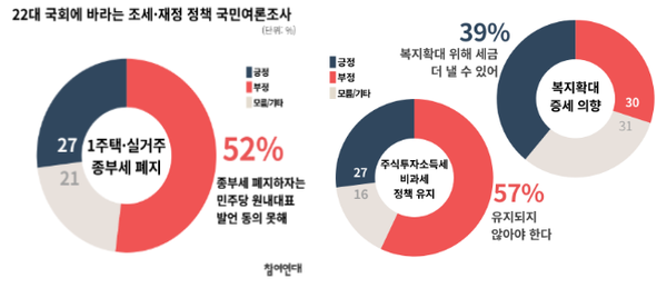종부세 폐지 정책과 관련된 응답에선 부정적 응답(52%)이 긍정적 응답(27%)보다 약 2배 가량 많이 나온 것으로 나타났다. 이는 이념·성향별로 살펴보아도 모두 부정 응답이 높게 나타났다. 또한, 주식투자소득에 대해서도 과반수 이상의 국민(57%)이 세금을 부과해야 한다고 인식하고 있는 것으로 확인되었다.