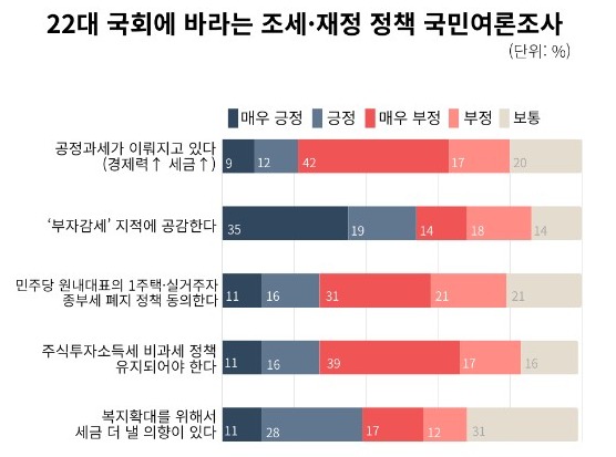 설문조사는 총 5가지 문항으로 ▲정부의 조세재정정책이 경제적 능력이 큰 사람들에게 더 많은 세금을 부담하게 한다고 생각하는지(공정과세 여부), ▲정부의 감세정책이 ‘부자감세’라는 지적에 공감하는지, ▲1주택자·실거주자에 대한 종부세를 전면 폐지하겠다는 민주당 원내대표 주장에 대해 어떻게 생각하는지, ▲주식 투자로 얻은 소득에 대해서 세금을 부과하지 않겠다는 정책이 유지되어야 한다고 생각하는지, ▲복지확대를 위해서라면 세금을 더 낼 의향이 있는지에 대해 물었다.