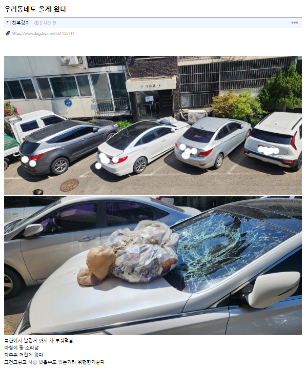 지난 2일 오전 한 인터넷 커뮤니티에는 북한 오물풍선으로 자동차 앞 유리창이 박살이 난 현장 사진이 올라왔다. 차 위에는 각종 오물이 담긴 봉지가 떨어져 있었다.