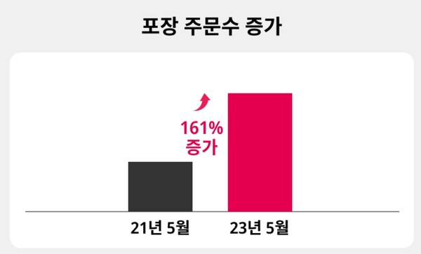이유는 포장 주문 수가 증가하고 있기 때문이다. 배달수수료 부담은 물론 나들이 가는 시기가 다가오자 배달보다 포장을 이용하는 소비자의 수가 늘고 있다. 요기요 사장님 포털 자료에 의하면 2023년의 포장주문이 2021년 대비 37% 이상 늘었다. 특히 가족의 달인 5월만 비교하면 무려 161% 이상 증가했다. 특히, 포장 주문 수 상위 10%인 가게의 경우, 전체 주문 중 약 30%가 포장 주문이었다.