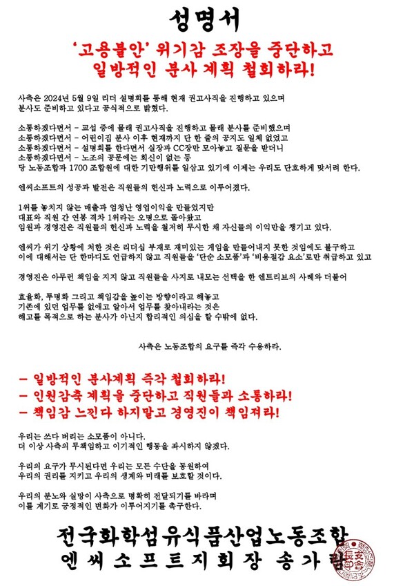 이런 노사 갈등은 엔씨소프트에서도 벌어지고 있다. 엔씨 노조는 5일 성명서를 내 사측이 고용불안 위기감 조장을 중단하고 일방적인 분사 계획을 철회하라고 요구했다.