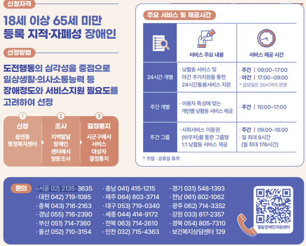 신청은 발달장애인 본인 또는 보호자 등이 주소지 행정복지센터에서 할 수 있으며 도전행동, 의사소통능력, 일상생활수행능력 및 지원 필요도를 기준으로 방문조사와 시·도별 서비스조정위원회 심의를 거쳐 선정한다.