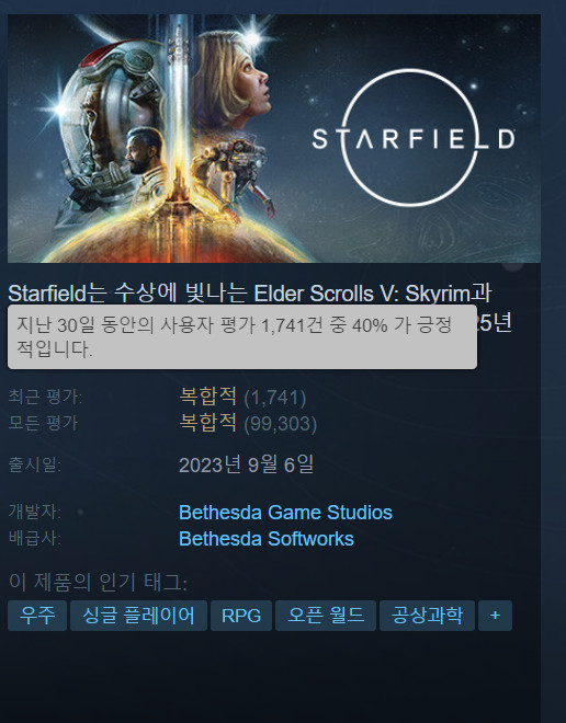 하지만 트레일러가 공개와 업데이트가 이루어진 10일 이후 이용자들의 비판이 이어지며 스타필드의 스팀 이용자 평가가 급격히 하락하고 있다. 10일 당일에만 200개 넘는 부정적 평가가 올라왔으며, 이후에도 계속해서 부정적인 평가가 추가되는 상황이다.