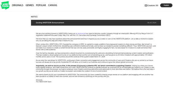 로이터통신은 “미국 캘리포니아주 로스앤젤레스에 본사를 둔 웹툰은 미국 경제의 연착륙 가능성이 높아지는 가운데 주식 시장 상장에 대한 투자자의 선호도를 높이기 위해 노력하는 기업 명단에 합류했다”고 보도했다.